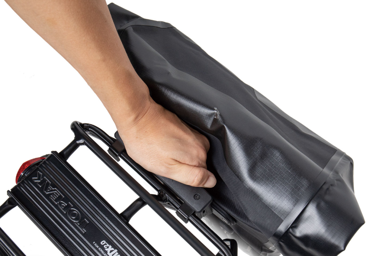 Герметичная застёжка roll-top защищает содержимое от влаги и позволяет удобно регулировать объём сумки. Уникальная система крепления Handle Loc обеспечивает быстрый и надёжный монтаж на багажник: просто нажмите и потяните за верхнюю ручку — и сумка легко снимается или устанавливается.
